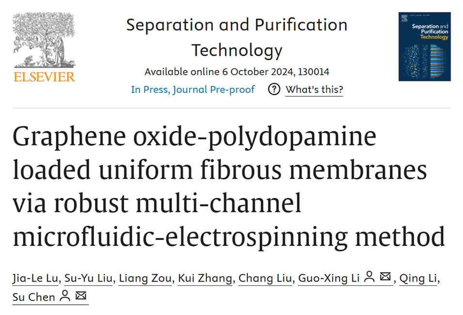 近期,南京工业大学陈苏教授团队采用微流控静电纺丝技术高效制备了GO-PDA/热塑性聚氨酯(GO-PDA/TPU)复合纤维膜,该膜对阳离子染料具有选择性吸附和分离能力,对单一和混合染料溶液的去除效率高达99%,并且具有优异的耐用性和可重复使用性,有望在废水净化中实际应用。相关研究以“Graphene oxide-polydopamine loaded uniform fibrous membranes via robust multi-channel microfluidic-electrospinning method”为题目,发表在期刊《Separation and Purification Technology》上。