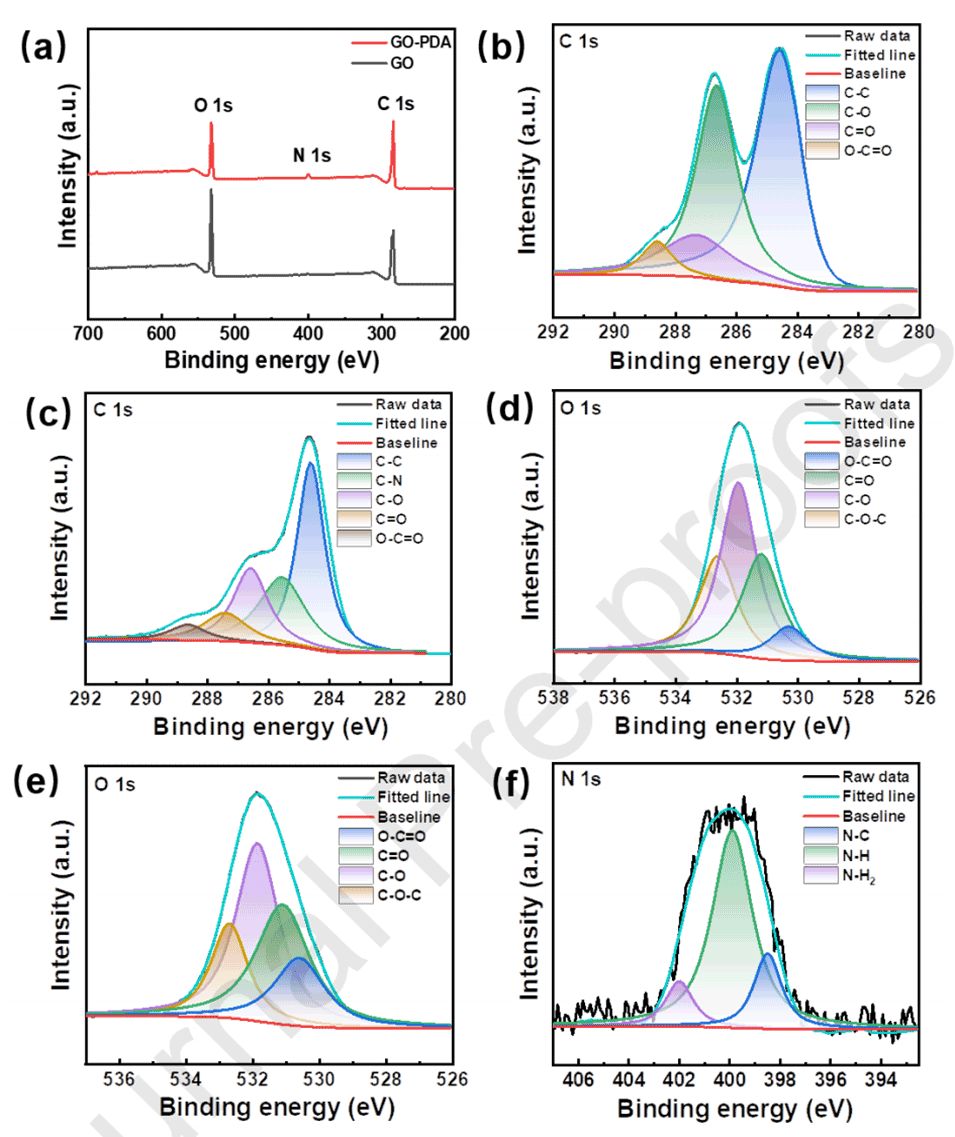 图3.(a)GO和GO-PDA的高分辨率XPS光谱。GO的(b)C 1s和(d)O 1s的XPS光谱。GO-PDA的(c)C 1s、(e)O 1s和(f)N 1s的XPS光谱。