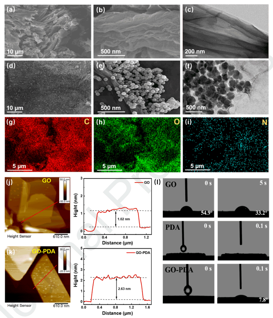 图1.(a)GO的SEM图像和(c)TEM图像。(d,e)GO-PDA的SEM图像和(f)TEM图像。(g-i)GO-PDA中C、O、N元素的EDS映射。(j)GO和(k)GO-PDA的AFM图像。(l)GO、PDA和GO-PDA的接触角图像。