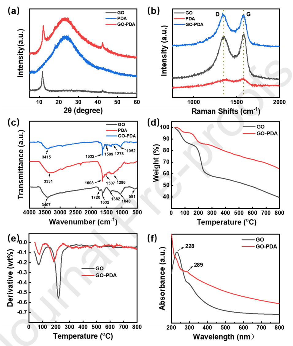 图2.(a)GO、PDA和GO-PDA的XRD图谱、(b)拉曼光谱和(c)FT-IR光谱。(d)GO和GO-PDA的TGA曲线、(e)DTG曲线和(f)UV-Vis光谱。