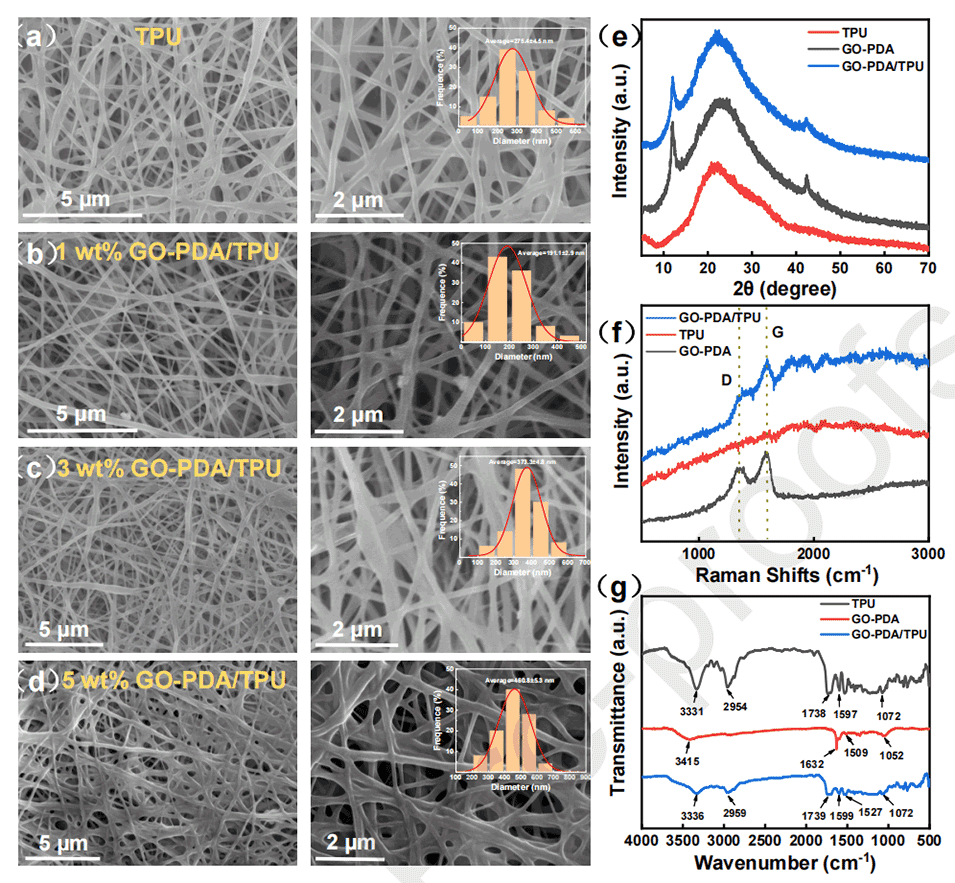图4.(a)TPU以及(b-d)GO-PDA含量为1%、3%和5wt%的GO-PDA/TPU纤维膜的SEM图像和尺寸分布。(e)TPU、GO-PDA和GO-PDA/TPU的XRD图谱、(f)拉曼光谱和(g)FT-IR光谱。
