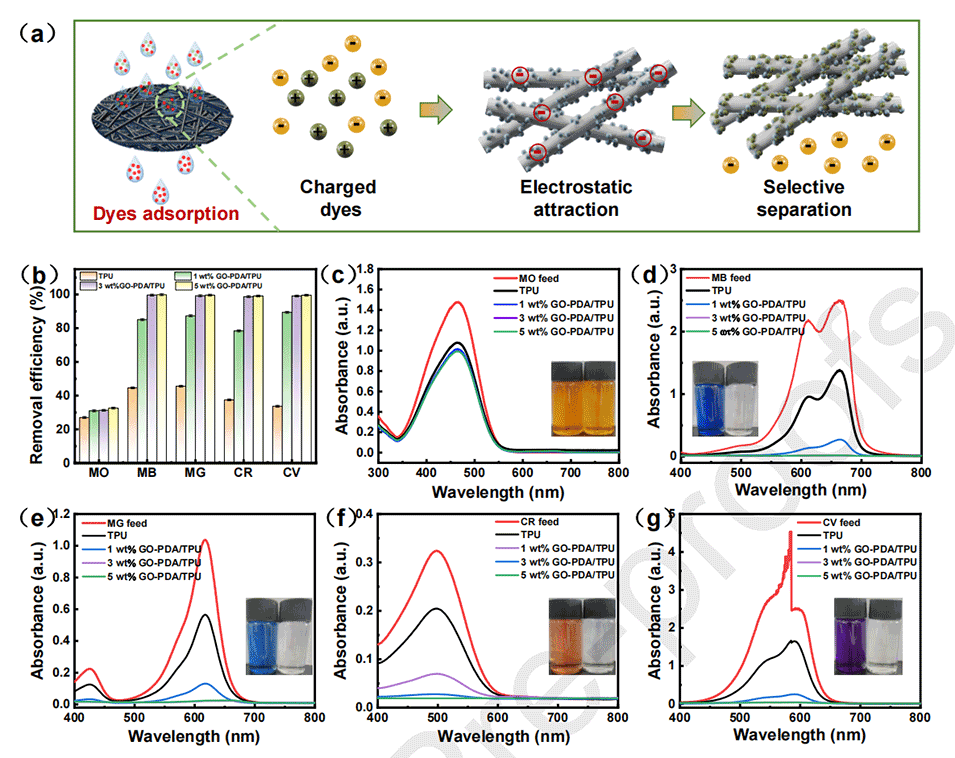 图6.展示了GO-PDA/TPU纤维膜对染料吸附和分离能力的评估。(a)GO-PDA/TPU纤维膜对阳离子和阴离子染料吸附和分离机制的示意图。(b)不同GO-PDA含量的GO-PDA/TPU纤维膜对多种染料溶液的去除效率。(c-g)纯TPU和GO-PDA/TPU纤维膜过滤前后MO、MB、MG、CR和CV溶液的UV-Vis吸收光谱。