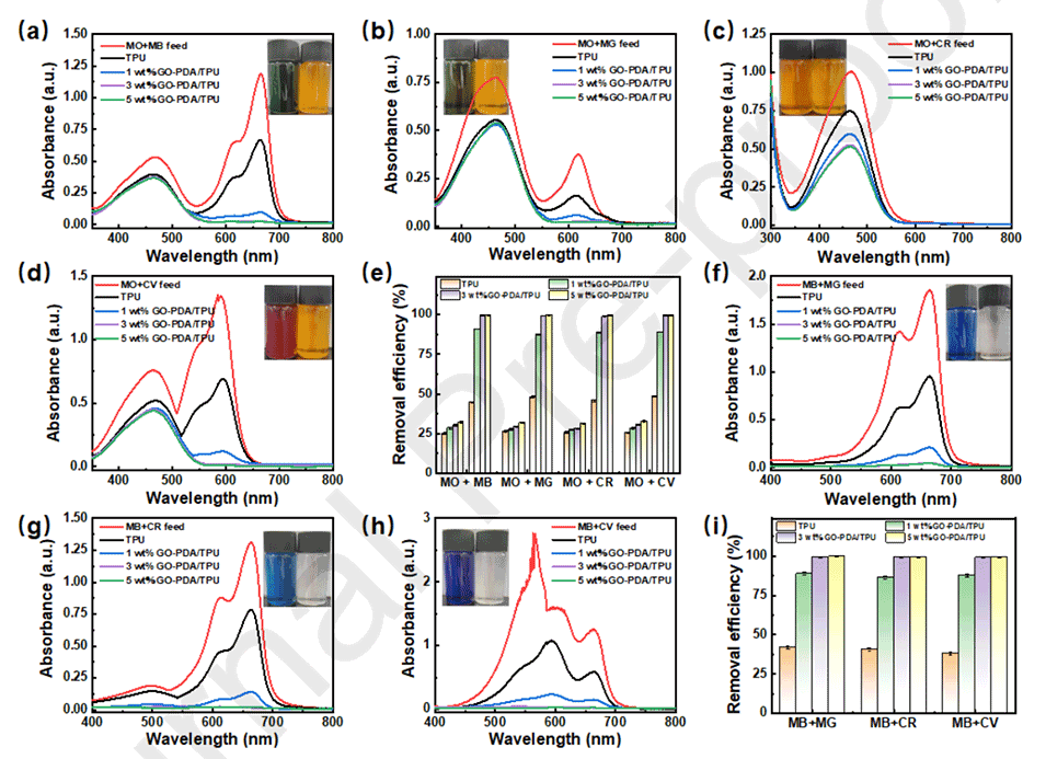图7.展示了GO-PDA/TPU纤维膜对混合染料选择性吸附能力的评估。(a-e)纯TPU和GO-PDA/TPU纤维膜过滤前后MO/MB、MO/MG、MO/CR和MO/CV混合染料溶液的UV-Vis吸收光谱。(f-h)纯TPU和GO-PDA/TPU纤维膜过滤前后MB/MG、MB/CR和MB/CV混合染料溶液的UV-Vis吸收光谱。(i)不同GO-PDA含量的GO-PDA/TPU纤维膜对MB/MG、MB/CR和MB/CV混合染料溶液的吸附能力。