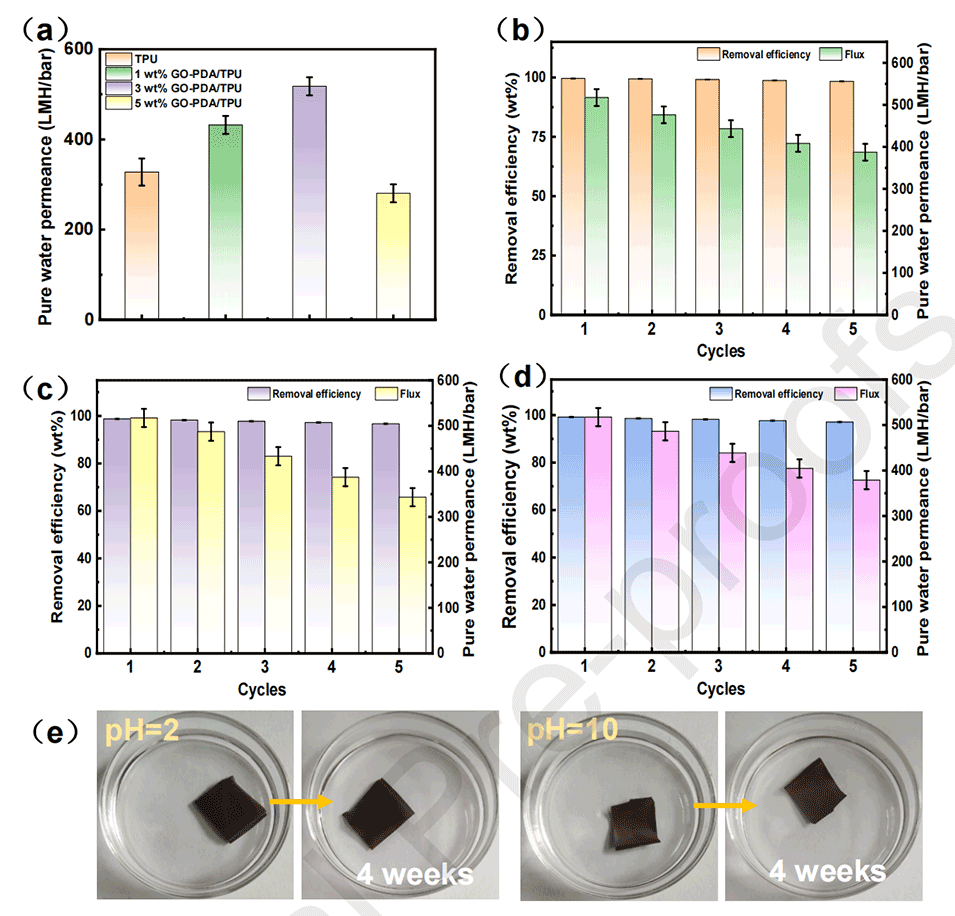 图8.(a)纯TPU和不同GO-PDA含量的GO-PDA/TPU纤维膜的纯水通量。(b-d)GO-PDA/TPU纤维膜在MG、CR和CV溶液中的循环稳定性。(e)GO-PDA/TPU纤维膜在酸性和碱性溶液中的长期稳定性。