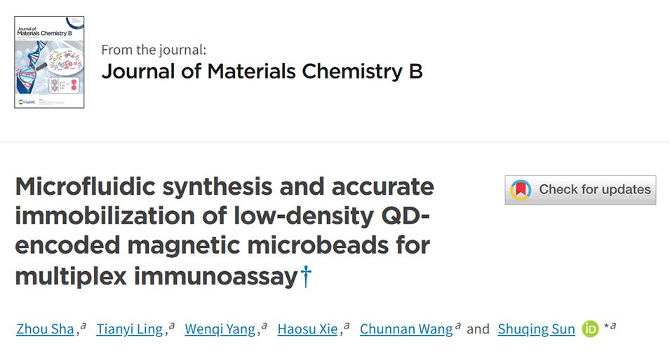 近期,清华大学深圳国际研究生院孙树清研究员团队提出了一种利用微流控芯片合成和精确固定低密度量子点编码磁性微珠的新方法,用于多重免疫检测,并通过镍图案、磁铁和通道的集成展示了精确捕获单个微珠的能力,利用荧光编码进一步增强了该方法进行多重免疫检测的能力。相关研究以“Microfluidic synthesis and accurate immobilization of low-density QD-encoded magnetic microbeads for multiplex immunoassay”为题目,发表在期刊《Journal of Materials Chemistry B》上。