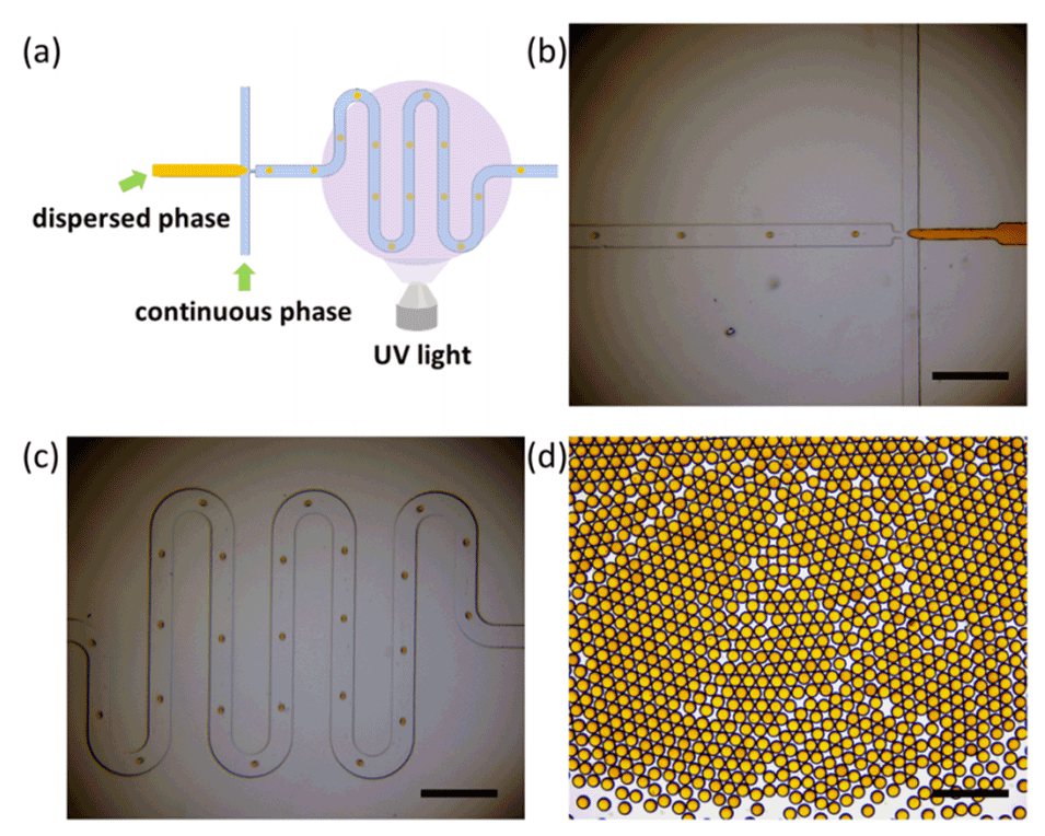 图1:展示了微流控芯片的示意图以及微珠的聚合过程。(a)微流控芯片的流动聚焦部分和微珠聚合的示意图。(b)在喷嘴处生成的液滴。(c)液滴流过曲折通道。(d)微珠的光学图像。