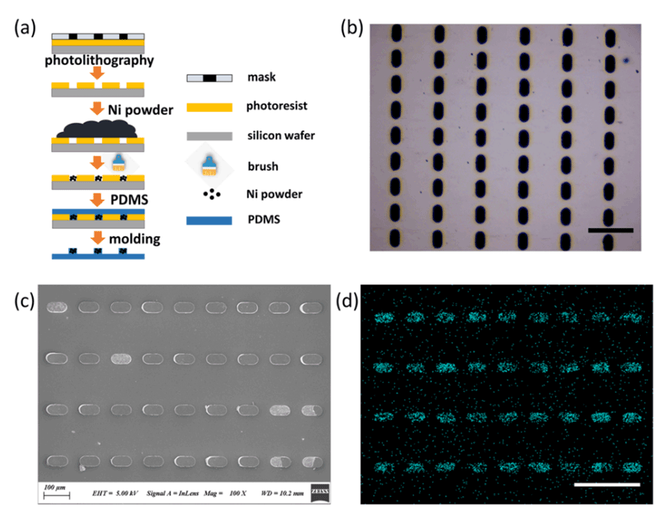图3:展示了镍图案的制备流程。(a)制备镍图案的流程图。(b)镍图案的光学图像。(c)镍图案的扫描电子显微镜(SEM)图像。(d)图3c中镍(蓝色点)的能谱分析(EDS)分析。(e)微珠的荧光图像和相应的光学图像(插图)。