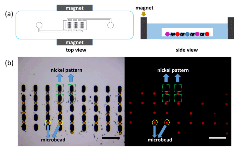 图4:展示了镍图案与微通道的集成。(a)镍图案和微通道集成的顶视图和侧视图。(b)镍图案捕获的微珠的光学图像和相应的荧光图像。