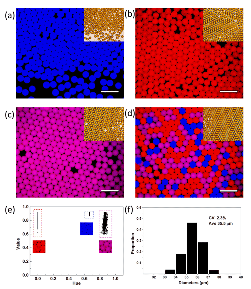 图2:展示了不同编码的磁性微珠。(a)嵌入620nm发射峰量子点的微珠的荧光图像和相应的光学图像(插图)。(b)嵌入450nm发射峰量子点的微珠的荧光图像和相应的光学图像(插图)。(c)嵌入450nm和620nm发射峰量子点(质量比为4:1)的微珠的荧光图像和相应的光学图像(插图)。(d)所有三种微珠的荧光图像和相应的光学图像(插图)。(e)HSV色彩空间中像素的分布。(f)微珠尺寸分布。