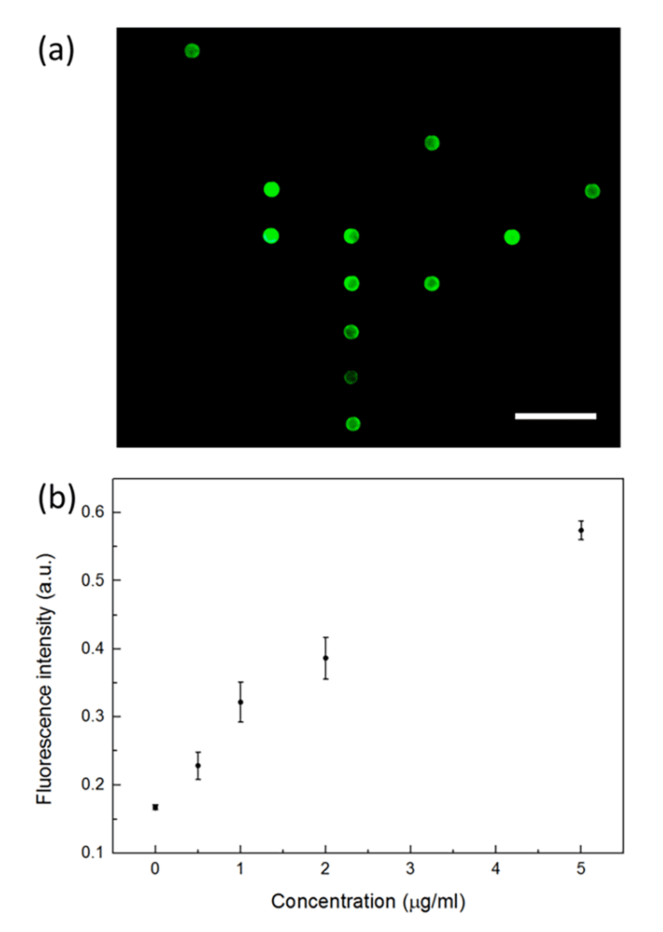 图6:展示了抗人IgG浓度与微珠荧光强度之间的关系。(a)镍图案捕获的微珠的荧光图像。(b)抗人IgG浓度与微珠荧光强度的关系图。