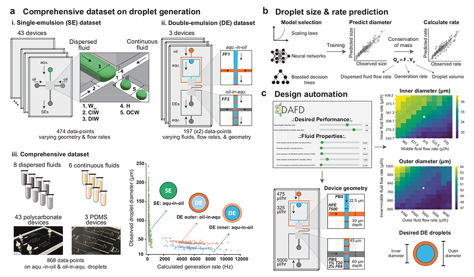 图1.展示了如何将数据整合并训练模型以实现单乳液和双乳液液滴生成的性能预测和设计自动化。