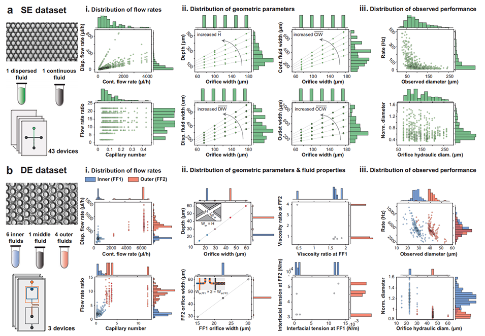图2.展示了通过使用多种设备几何形状、流体属性和流速产生的单乳液和双乳液液滴的全面数据集。