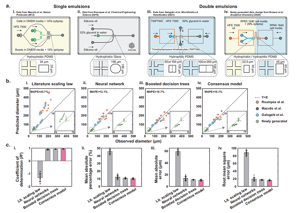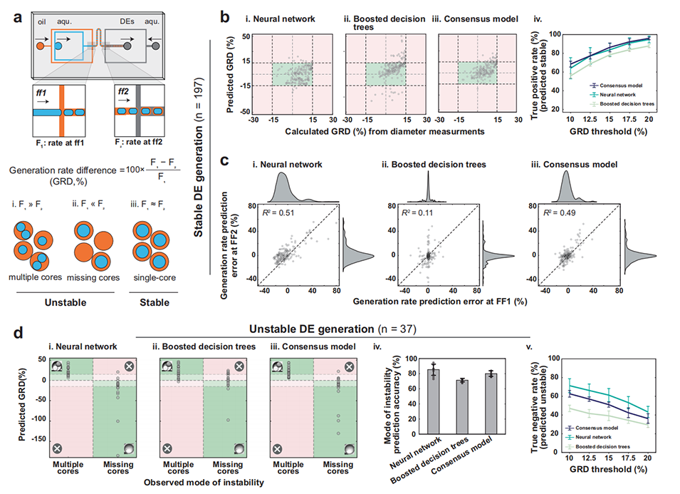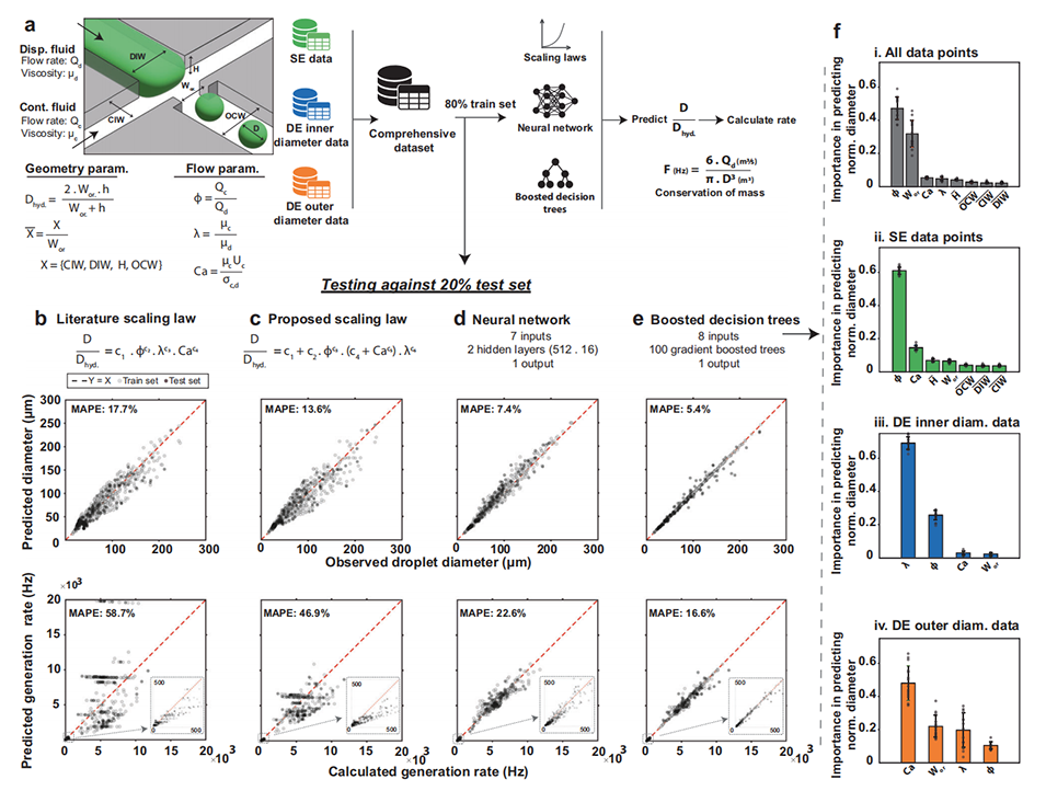 图3.展示了使用增强决策树和神经网络准确预测单乳液和双乳液液滴直径和生成速率的能力。