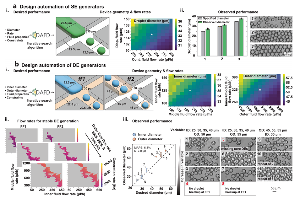 图6.展示了使用训练有素的机器学习模型和自定义搜索算法实现单乳液和双乳液液滴生成的设计自动化。