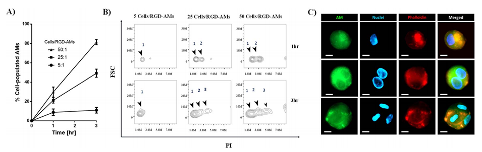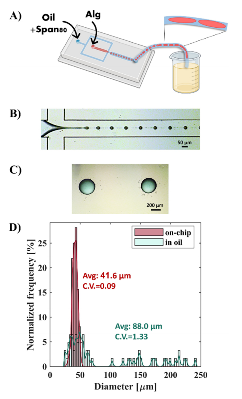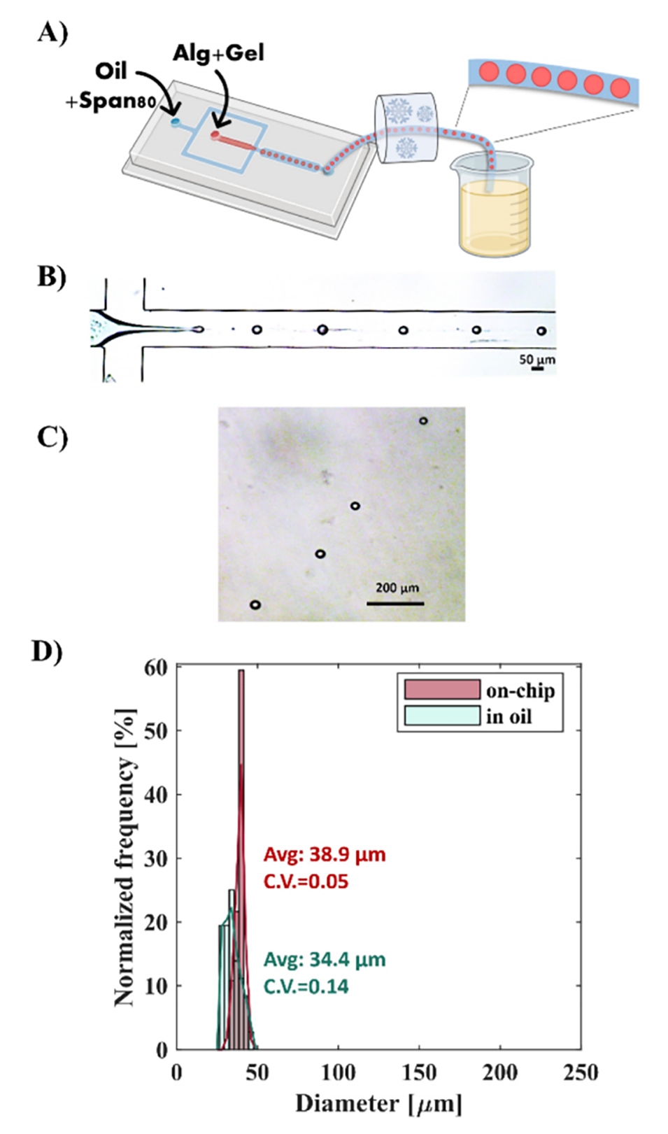 1、本研究提出了一种基于温控微流体的外部凝胶化方法,以生成单分散的低浓度(0.5% w/v)RGD修饰海藻酸盐微球。