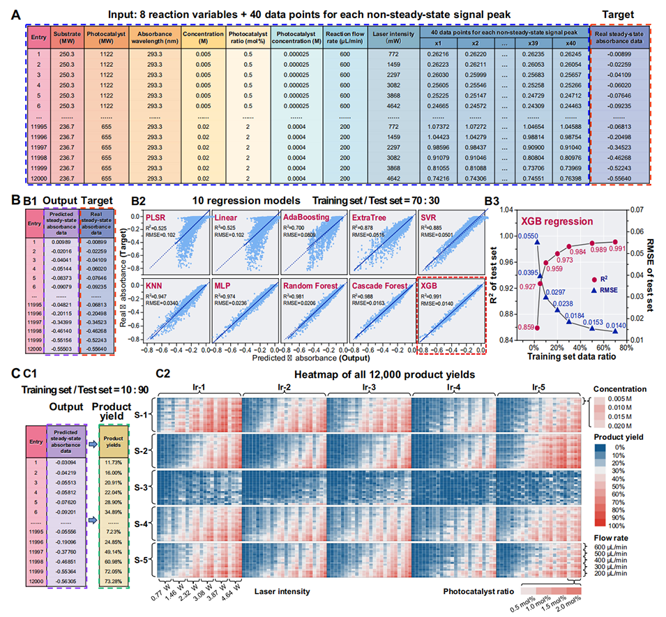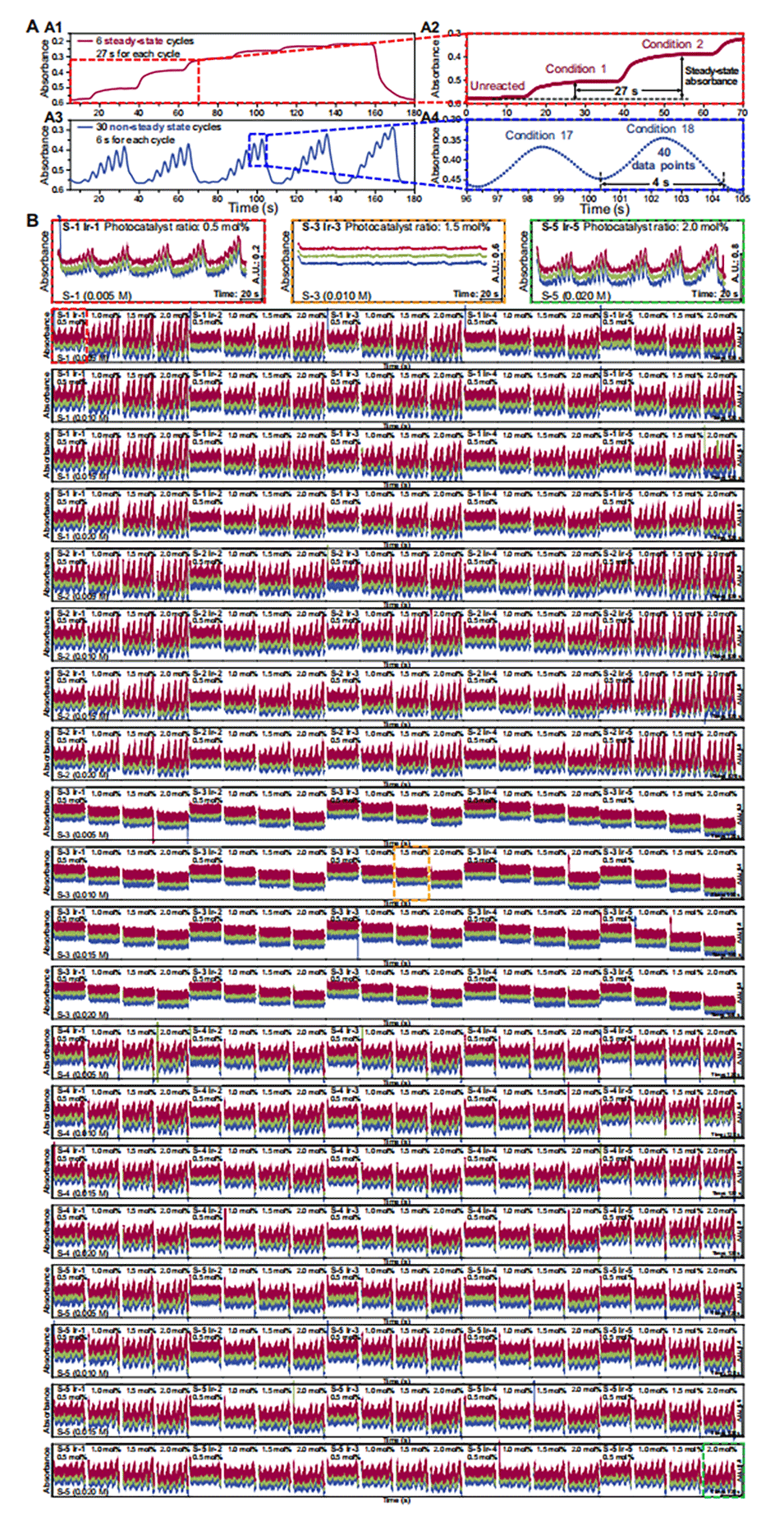 图4.根据非稳态吸光度数据AI辅助预测稳态吸光度数据,用于光催化[2+2]环加成反应的条件筛选。