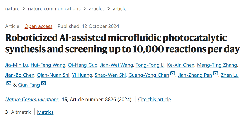 近日,浙江大学陆展教授、方群教授、潘建章研究员与之江实验室陈广勇研究员团队共同开发了一种新型的机器人系统,结合液芯波导、微流控技术和人工智能,实现了超高通量的光催化化学合成和条件筛选,日处理反应条件可达10,000个,显著提高了反应效率和数据生成能力。相关研究以“Roboticized AI-assisted microfluidic photocatalytic synthesis and screening up to 10,000 reactions per day”为题目,发表在期刊《Nature Communications》上。
