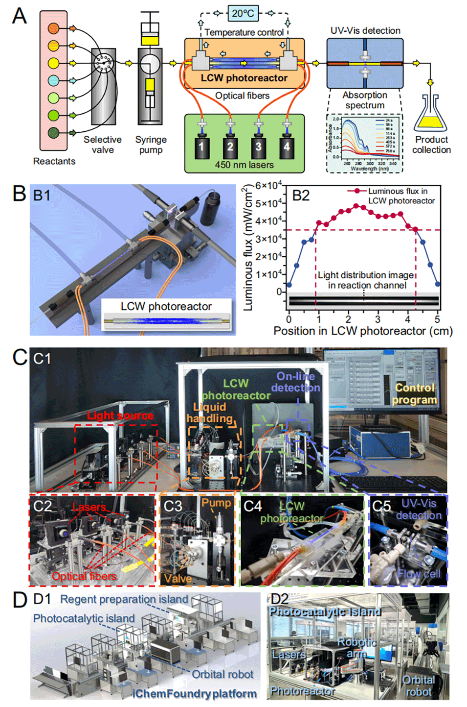 2、该系统结合了液芯波导、微流控液体处理和人工智能技术,能够自动进行反应物混合物的制备、更换、引入,在几秒钟内进行超快速光催化反应、在线检测反应产物,并筛选不同的反应条件。