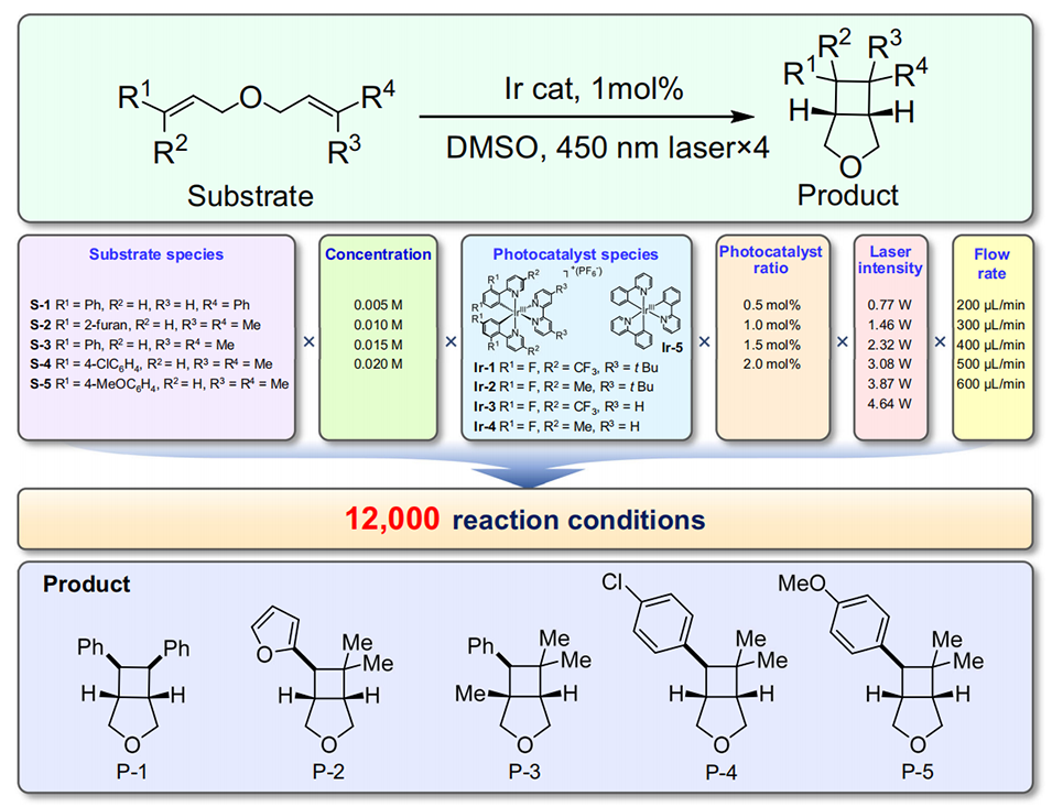 3、在光催化[2 + 2]环加成反应中应用该系统,筛选了12,000种反应条件,显著提高了反应效率。