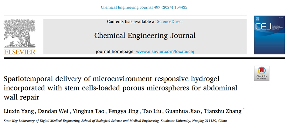 近期,东南大学生物科学与医学工程学院张天柱教授团队开发了一种响应微环境的水凝胶平台(MSC-GSM@HG),通过空间和时间控制释放载有间充质干细胞的多孔微球,以促进腹壁缺损的修复,克服了传统干细胞治疗中的低植入率和生存率问题。相关研究以“Spatiotemporal delivery of microenvironment responsive hydrogel incorporated with stem cells-loaded porous microspheres for abdominal wall repair”为题目,发表在期刊《Chemical Engineering Journal》上。