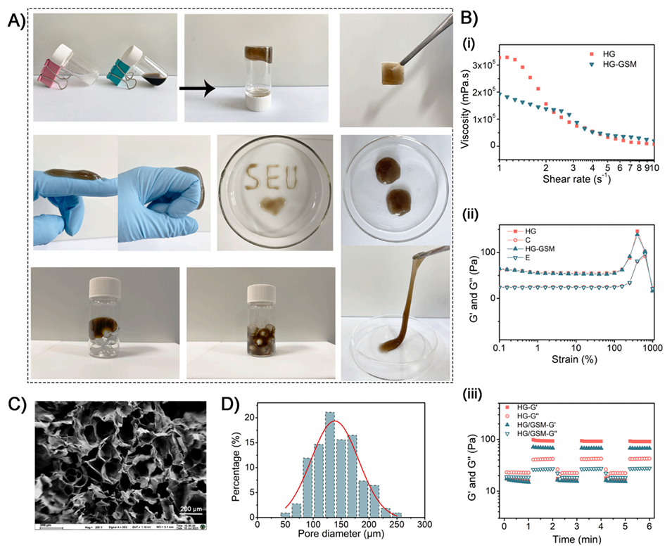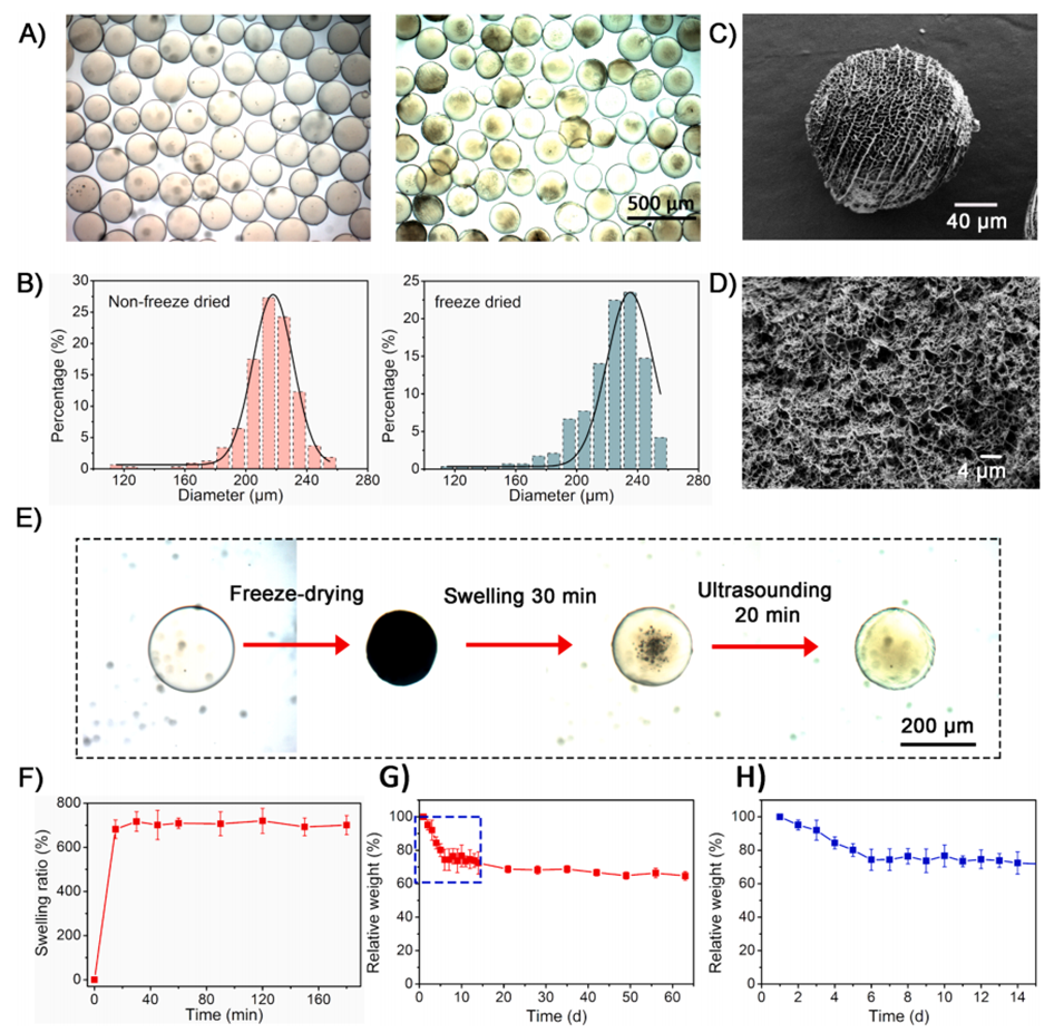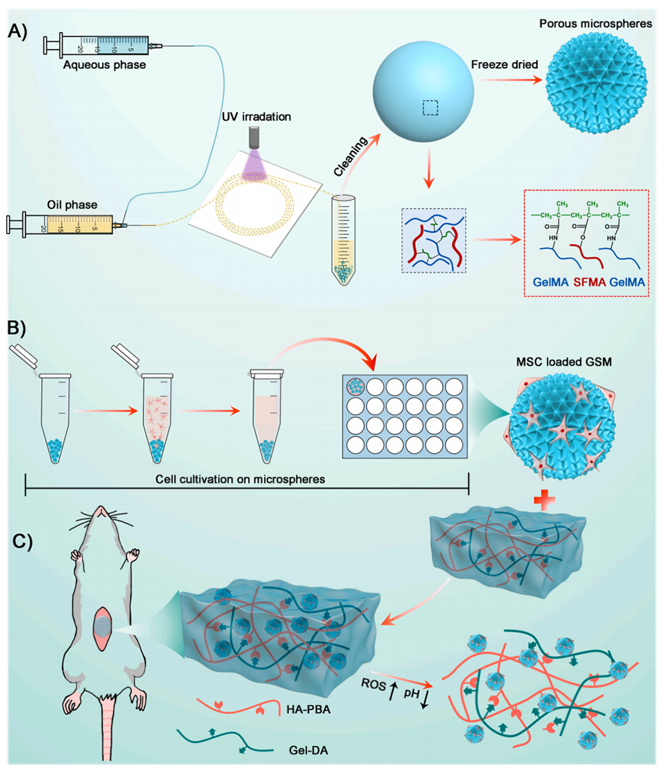 1、微环境响应性:该水凝胶能够在体内炎症反应下溶解,从而控制释放负载间充质干细胞(MSC)的多孔微球(GSM),确保干细胞按需精准释放。