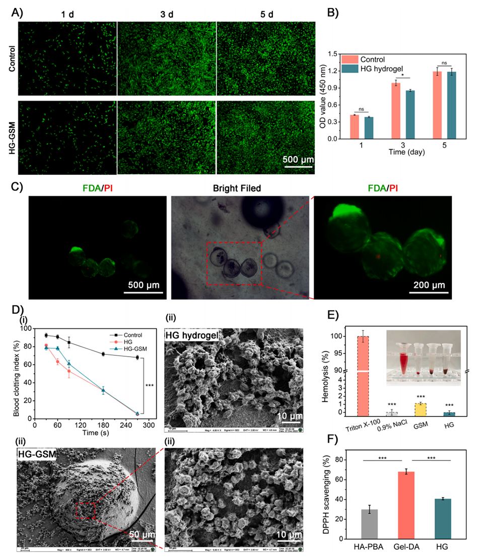 3、HG水凝胶不仅能保护MSC免受过量活性氧(ROS)的损害,还具备止血和抗炎特性。