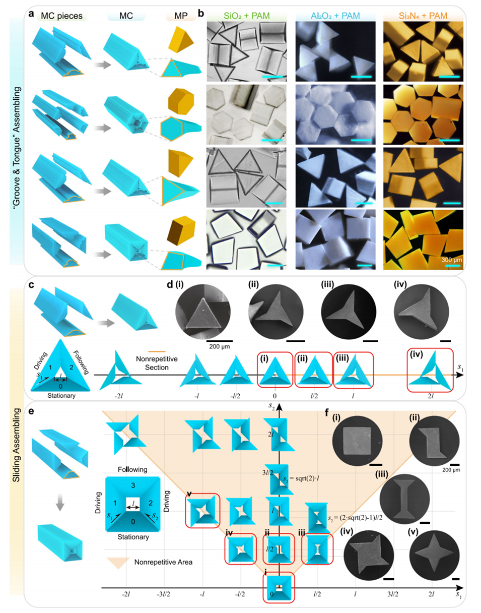 1、本文提出了一种创新的“一锅式微流体制造”系统,结合了“榫槽”和滑动组装两种策略,能够高效地生产多种复杂形状的陶瓷微粒。
