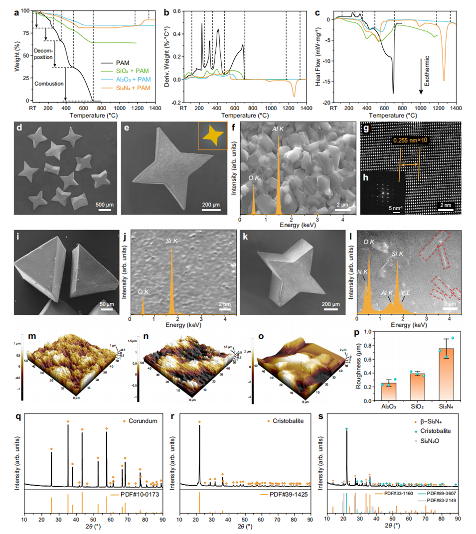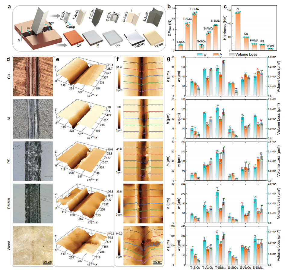 图5.使用不同材料(SiO2、Al2O3和Si3N4)制成的等腰三角形和星形陶瓷微颗粒(MP)的划痕测试结果。