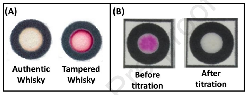 图4.(A)比色反应后检测真品和掺假威士忌样品中的焦糖。(B)基于氧化还原滴定法测定酒精含量。