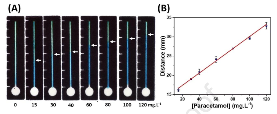 图5.(A)不同浓度的对乙酰氨基酚溶液(0-120mg/L)被加入到PAD上的圆形样品区域中,形成了深浅不同的普鲁士蓝颜色通道。(B)通过追踪PAD上的距离来检测对乙酰氨基酚的存在,从而产生分析曲线。