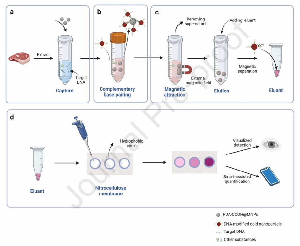 图7.提取DNA的过程,以及PDA-COOH@MNPs、金纳米颗粒和PADs如何结合起来以检测猪肉特有DNA的示意图。