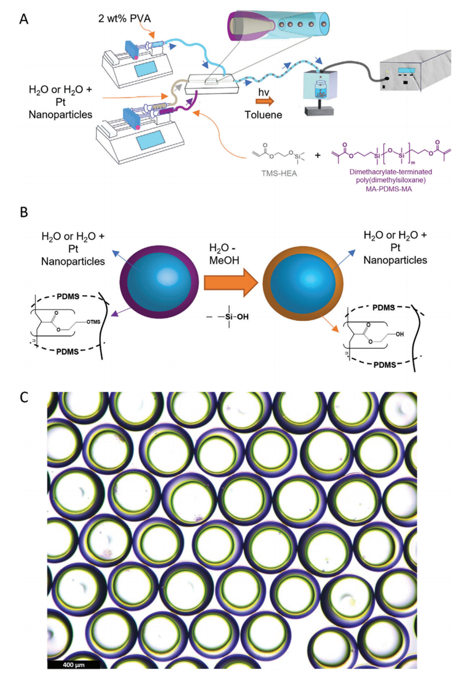 1、本研究采用微流控双重乳化法制备了一种新型微胶囊,其壳层材料为基于聚(2-羟乙基丙烯酸酯)和聚二甲基硅氧烷(PHEA-l-PDMS)的两亲性聚合物共网络(APCNs)。