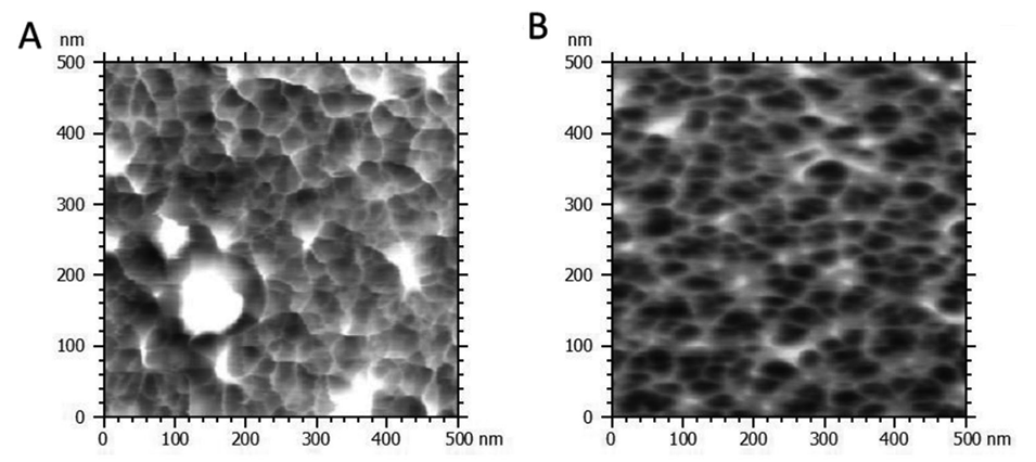 图2.内相中负载PtNPs的干燥APCN胶囊表面的AFM相图。A)第一次干燥循环。B)第二次干燥循环。