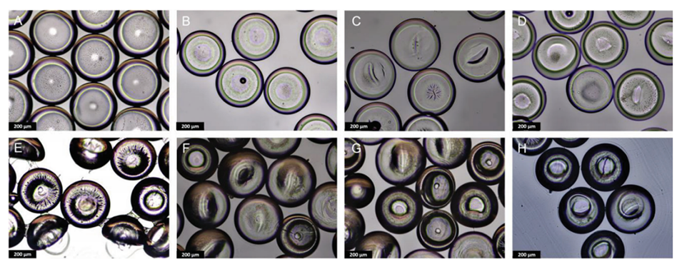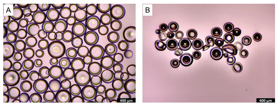 图3.经过4个水合和脱水循环的水合和干燥APCN微胶囊的透射光显微镜图像。