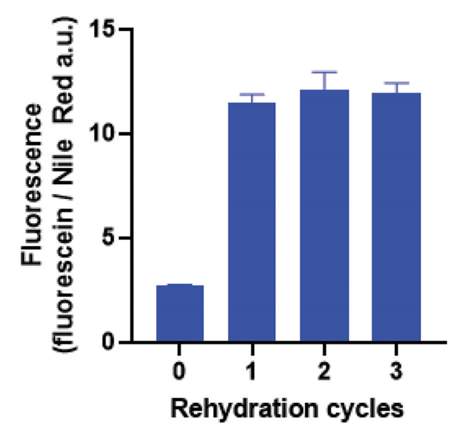 图7.在几个脱水-再水化循环中,荧光素从APCN微胶囊中释放出来。