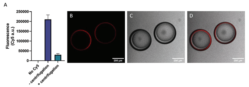 图9.用Cy5-PEG3500-胆固醇对APCN微胶囊进行表面功能化。