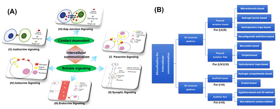 图1.(A)六种细胞间信号传导机制。(B)本文综述了用于细胞间通讯研究的微流体设备。