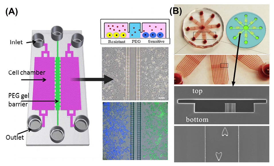 图3.(A)展示了由Patel等人开发的基于水凝胶屏障的PIB微流控实验装置的设计图。该装置用于共培养两种黑色素瘤细胞,以研究药物抗性机制。水凝胶屏障防止细胞混合,同时允许信号分子从一个细胞室扩散到另一个细胞室。(B)展示了由Zhu等人开发的基于流体动力学的PIB微流控设备的设计图。该设备用于探索癌细胞与基质细胞之间的相互作用机制,通过油隔离策略确保了高效且稳定的单细胞共培养。