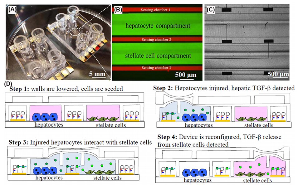 图4.展示了由Zhou等人开发的基于可重构壁的PIB微流控设备的设计图。该设备用于研究肝细胞与星状细胞之间的相互作用,通过气动操作来实现细胞间的分离和接触。