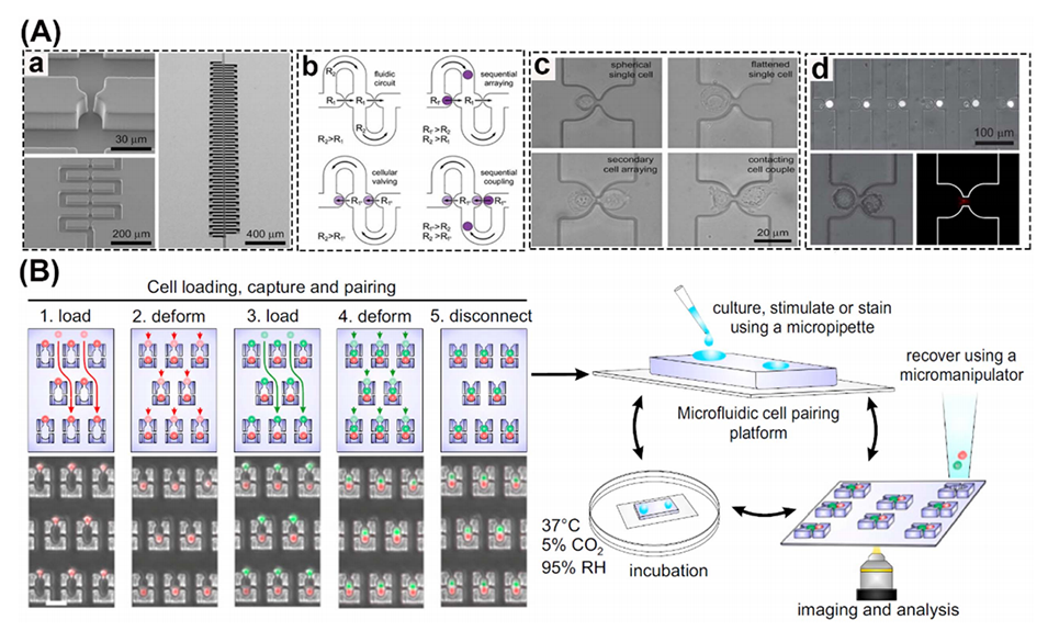 图7.(A)展示了由Frimat等人开发的基于流体动力学陷阱的PIF微流控单细胞共培养阵列系统的设计图。该设备用于研究细胞间的间隙连接,通过监测标记的连接蛋白来验证细胞间的连接。(B)展示了由Dura等人开发的基于流体动力学陷阱的PIF微流控共培养平台的设计图。该设备用于研究免疫细胞的杀伤活性,通过监测钙离子水平来评估细胞间的相互作用。