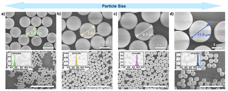 图1.通过使用不同的模板液滴自由调节粒径,粒径为a)5.4μm,b)7.4μm,c)9.3μm和d)11.0μm。插图显示了液滴合成微球的粒径分布和变异系数(CV)。