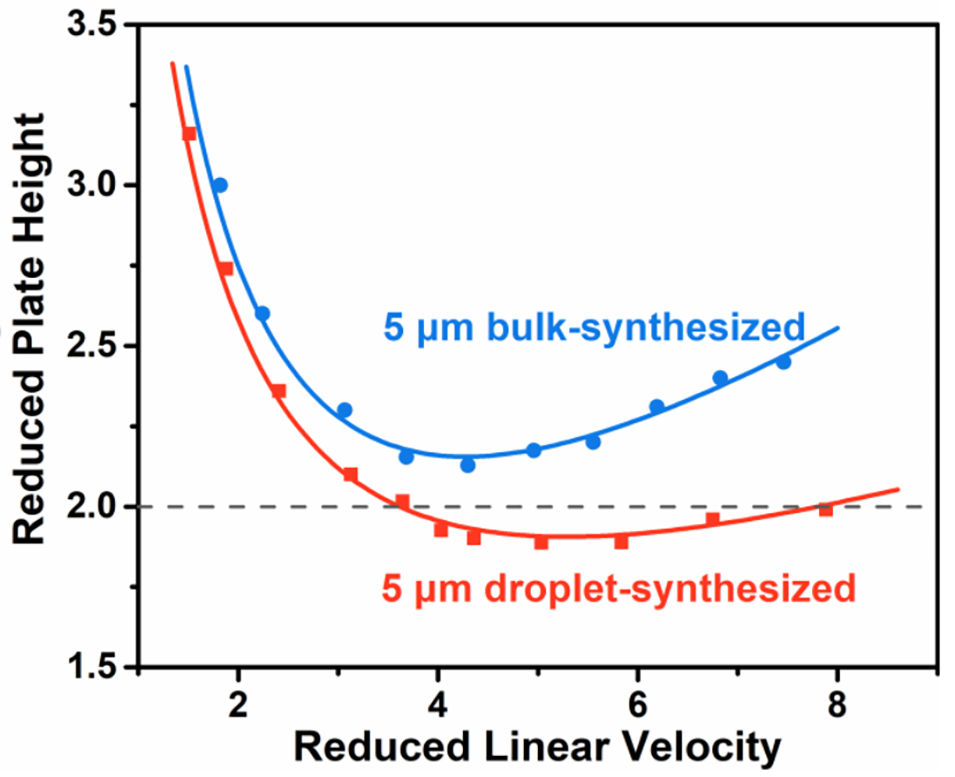 图2.液滴合成单分散微球和批量合成多分散颗粒的Knox曲线比较。