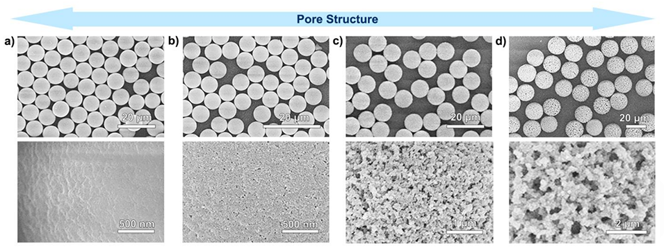 图3.液滴合成单分散微球中孔结构的自由调节,包括a)无孔,b)介孔,c)大孔和d)灌注结构。
