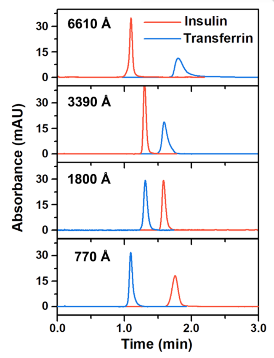 图4.胰岛素和转铁蛋白在不同孔径的液滴合成大孔微球上的分离和选择性变化。