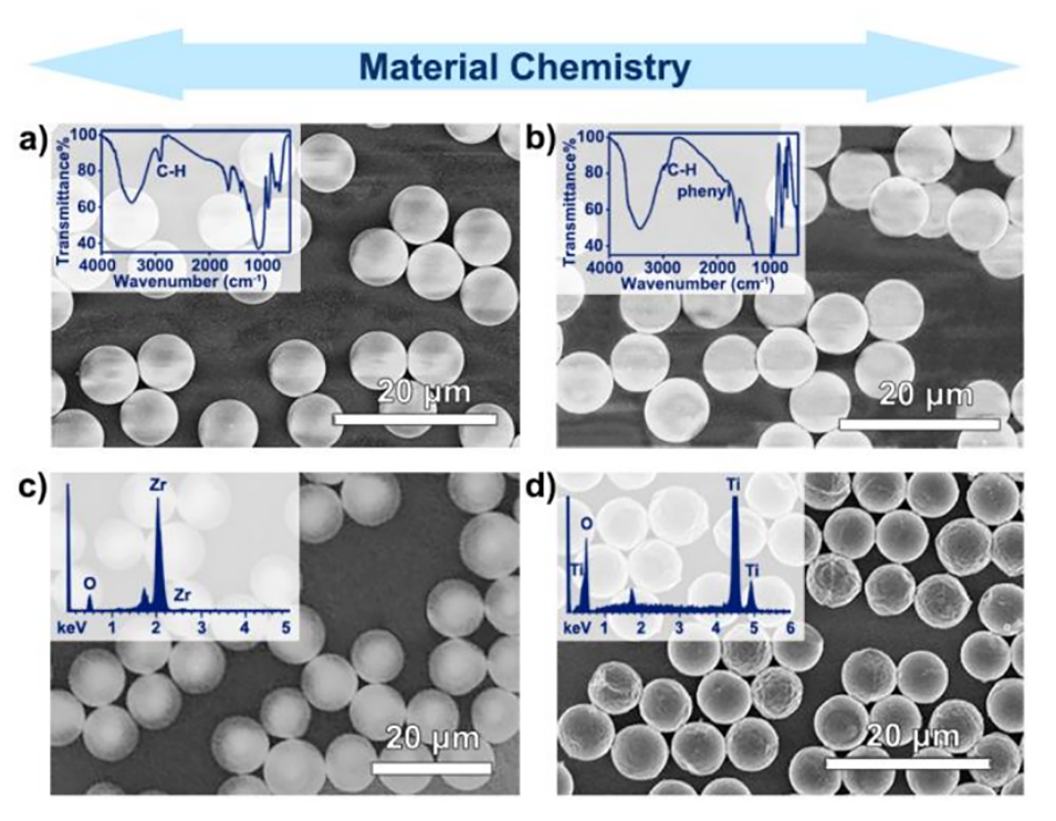 图5.由不同前体合成的单分散微球,包括a)乙烯桥联杂化二氧化硅,b)苯基桥联杂化二氧化硅,c)二氧化锆和d)二氧化钛。插图分别展示了通过红外光谱(a和b)和能量色散光谱仪(c和d)表征的不同材料的成分。