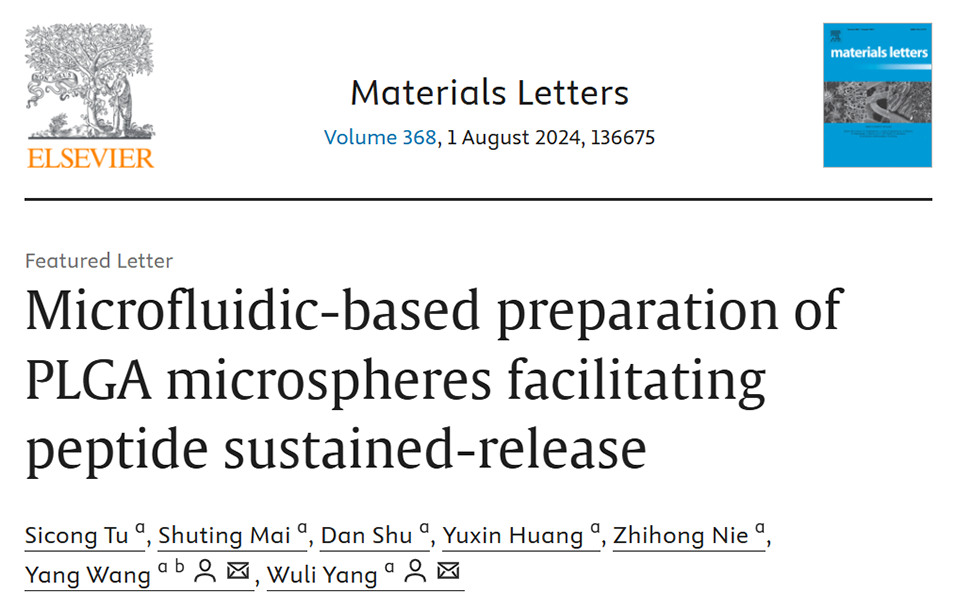 近期,复旦大学杨武利教授团队开发了一种微流控流动聚焦装置,用于制备和优化载有艾塞那肽(Exenatide)的聚乳酸-羟基乙酸共聚物(PLGA)微球。通过添加表面活性剂和优化工艺参数,显著提高了药物的负载能力和缓释性能,同时实现了生产效率的提升,达到每小时2克的生产速率。这项研究为肽类药物的缓释提供了新的方法,相关成果以“Microfluidic-based preparation of PLGA microspheres facilitating peptide sustained-release”为题,发表在期刊《Materials Letters》上。