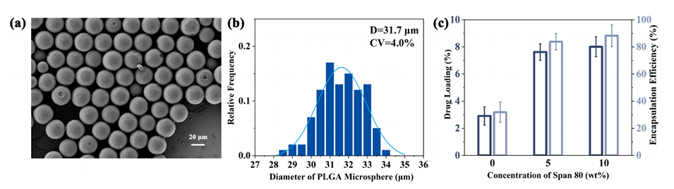 图2.(a)Ext负载PLGA微球的SEM图像,(b)粒径分布,(c)不同Span 80浓度制备的肽负载微球的DL和EE。