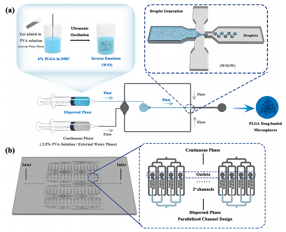 图1.(a)肽负载PLGA微球的制备;(b)多通道液滴微流体装置的设计。