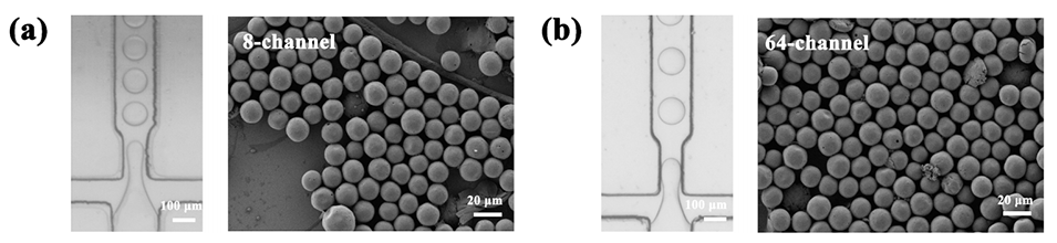 图4.由(a)8通道微流体设备和(b)64通道微流体设备生成的PLGA液滴的光学图像和Ext负载PLGA的SEM图像。