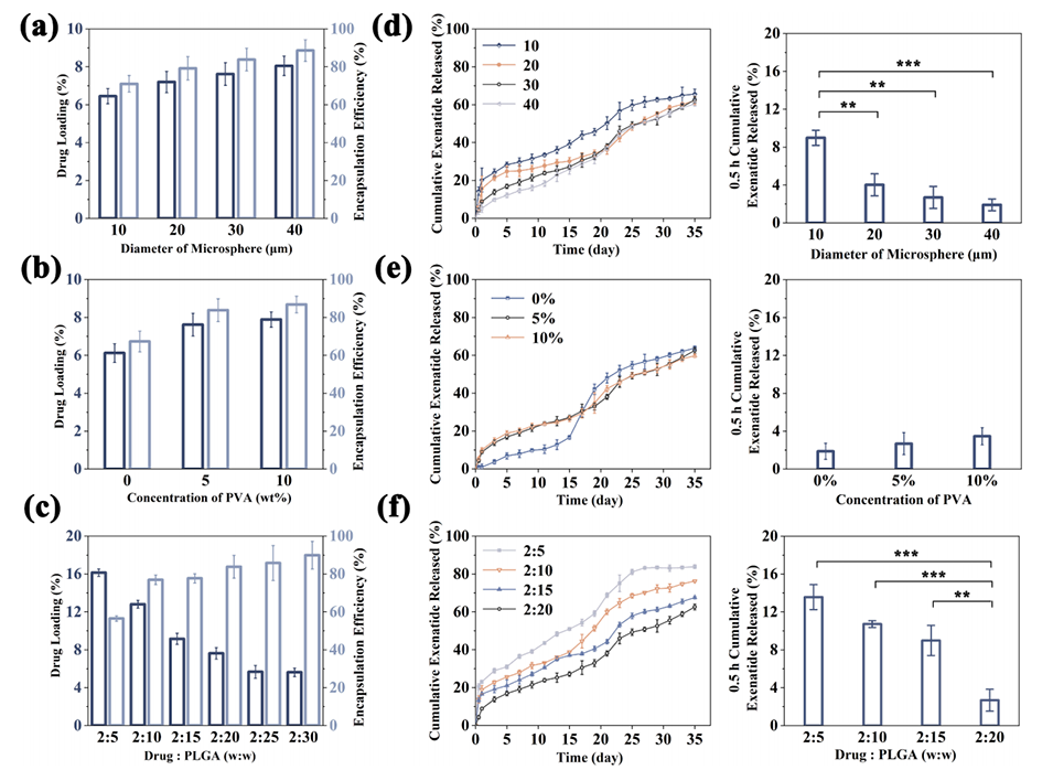 图3.(a)不同微球尺寸、(b)不同PVA浓度和(c)不同Ext与PLGA质量比制备的肽负载微球的DL和EE。(d)不同尺寸、(e)不同PVA浓度和(f)不同Ext与PLGA质量比制备的肽负载微球的释放曲线和0.5小时初始突释。